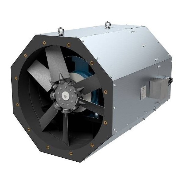 осевой вентилятор, максимальный расход воздуха 32 000 куб. м/ч, максимальный располагаемый напор 1 200 Па, взрывозащищенный, присоединительный размер 630 мм, материал корпуса: сталь, монтаж: в воздуховод, степень защиты: IP54